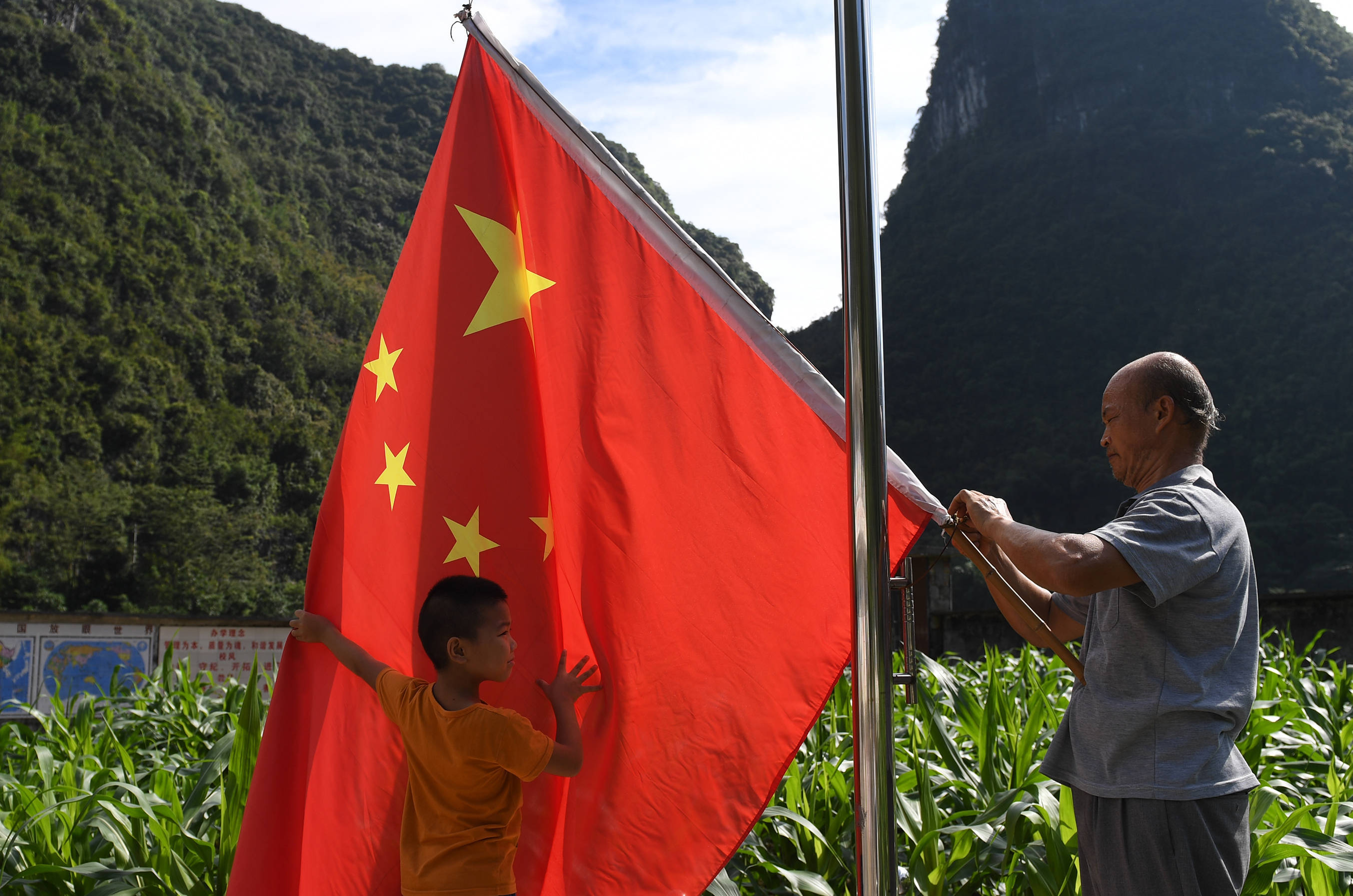 这样的画面也让我不禁想起40多年前我幼时亲历的场景:我上小学的学校位于桂西北巍巍大山之中。那个年代,大山条件非常艰苦,校舍是简陋的砖瓦结构房子,没有电,不通公路,从学校到乡镇所在地单程要走5个多小时的山路。就是在这样的条件下,学校依然坚持升国旗。没有旗杆,学校校长黄启福选了校园里一棵高高的椿树,请人爬上去把树枝树叶削掉,他用木头亲手制作一个滑轮固定在椿树顶部,装上绳子,每周一让全校师生在那棵椿树下的泥地上集合,他拿来自己的收录机,装上电池和磁带,咔嗒咔嗒按下音乐播放键,国歌响起,国旗升起——这是第一次参加升国旗仪式,我仍记忆犹新。