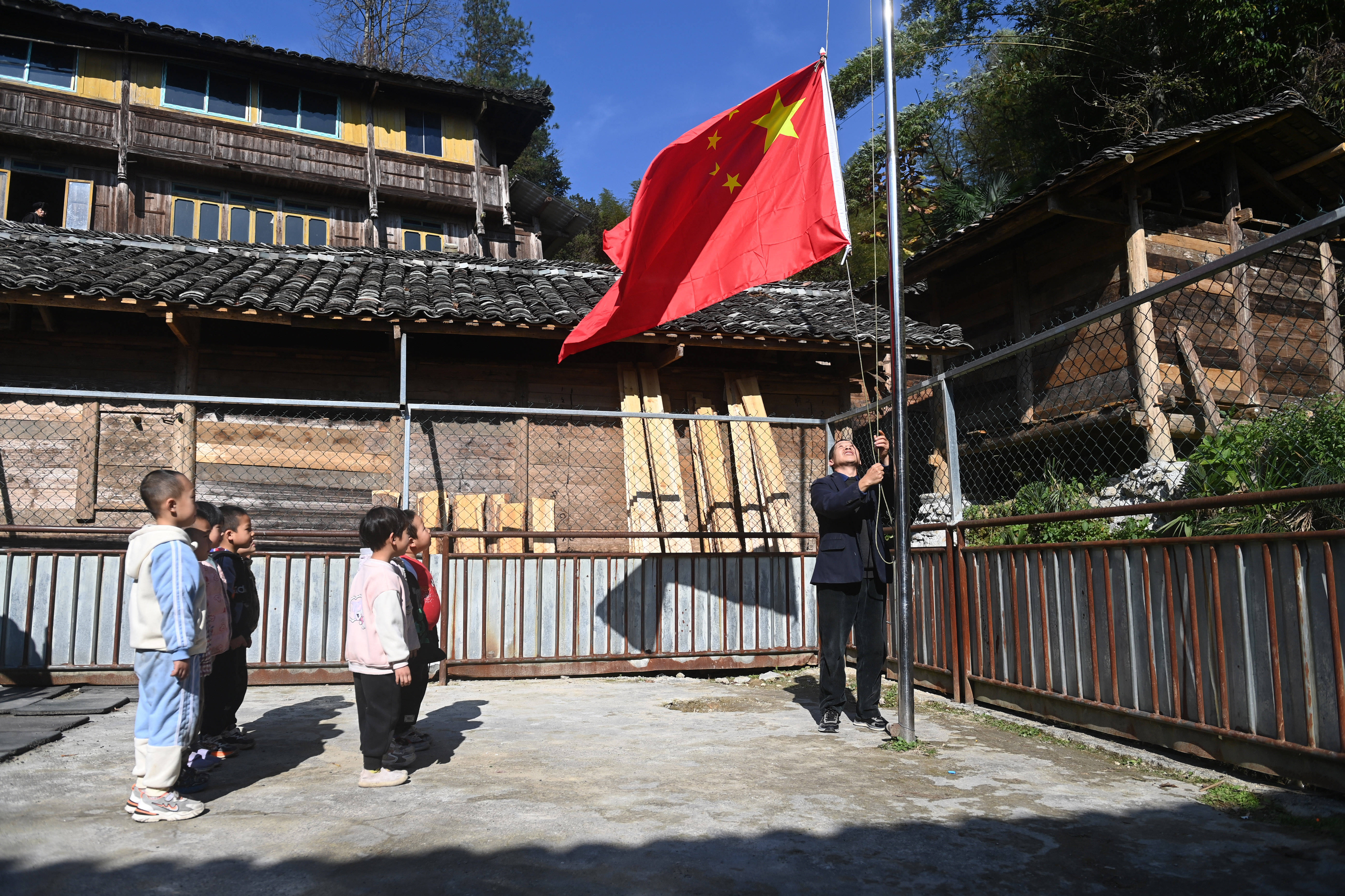 潘从汉是广西龙胜各族自治县龙脊镇满田小学唯一的老师,也是这所学校唯一的升旗手。2023年11月29日,我到这里采访时,潘老师正领着学生举行升国旗仪式,学生列好队后,他一个人站在旗杆下在国歌声中把国旗升起。他说,学生太小,都是七八岁的小孩,掌握不了升旗的节奏,升国旗这样庄严的仪式,得他亲自担当升旗手。当时,潘老师已年过60岁。2023年6月退休后,他接受返聘,又回到已经站了整整40年的讲台上。