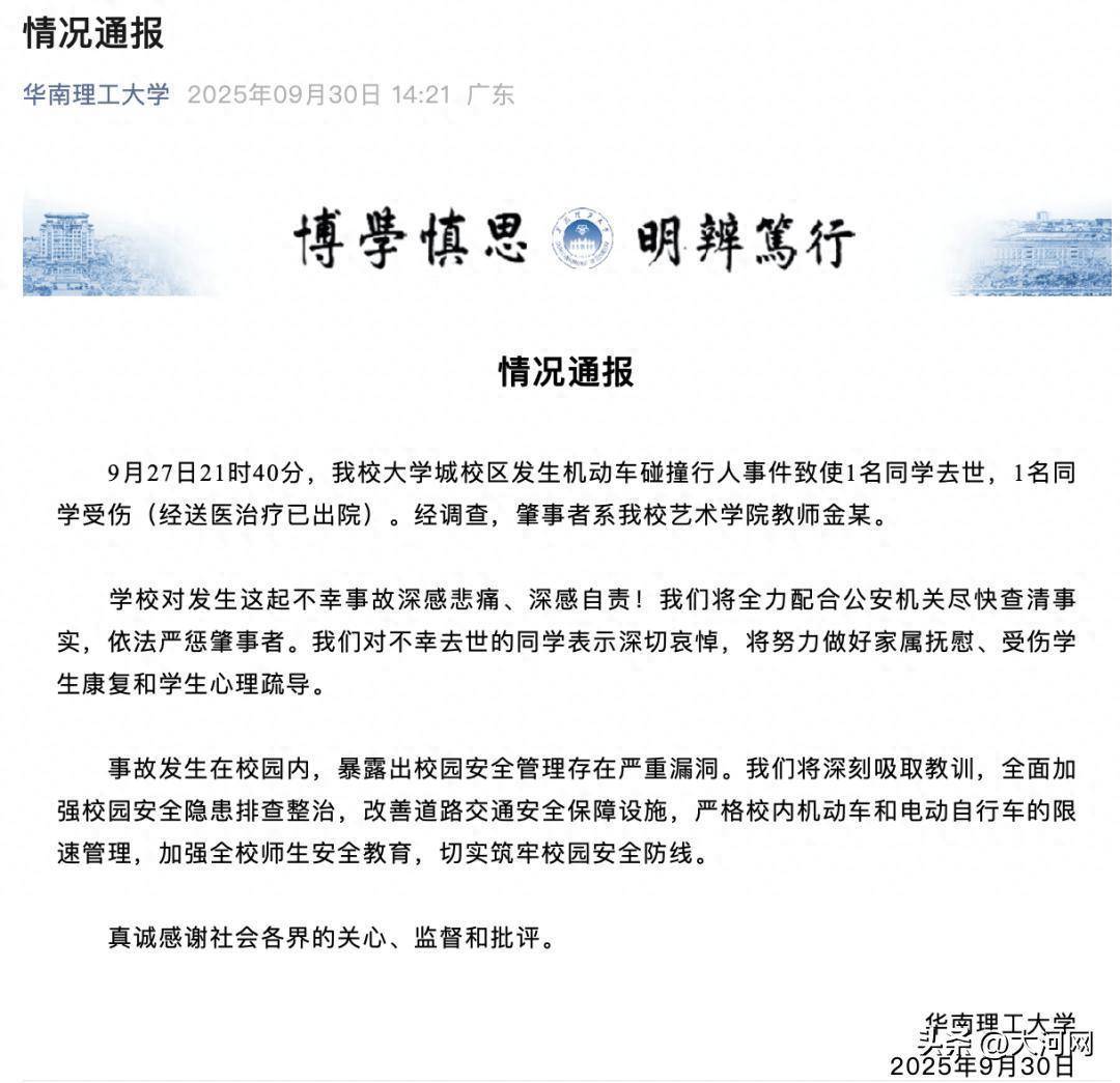 9月27日21时40分,我校大学城校区发生机动车碰撞行人事件致使1名同学去世,1名同学受伤(经送医治疗已出院)。经调查,肇事者系我校艺术学院教师金某。